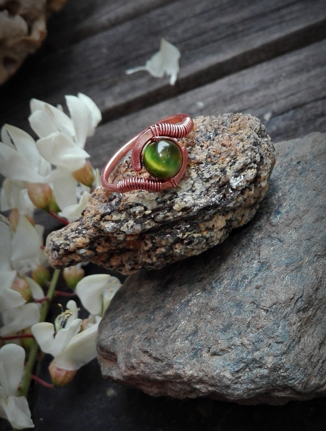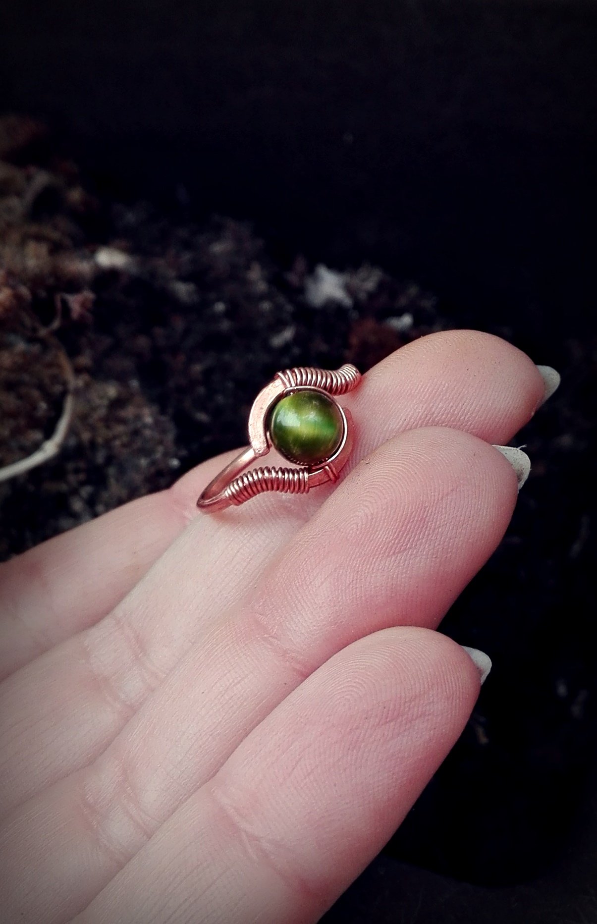 Az ékszerek alapja mind egyedi tervezés alapján készül vörösréz, illetve rézbetétes nikkelmentes ezüst drót felhasználásával. Minden darab egyedi és a természet motívumai inspirált minden részletet. Szeretettel, kézzel hajlítva alakul ki a végleges forma, amire gondos kalapálás után ásvány gyöngyök/kövek kerülnek.