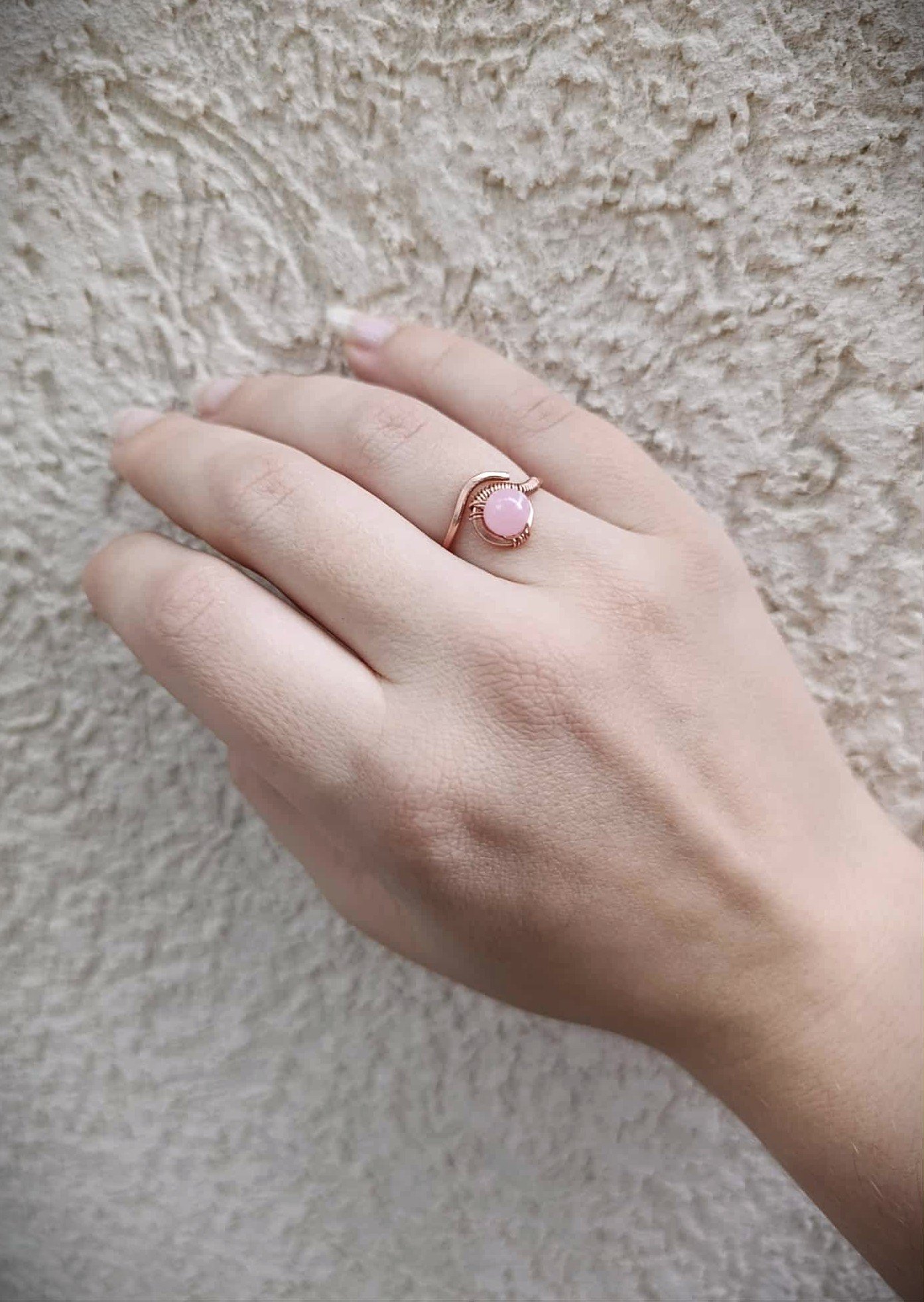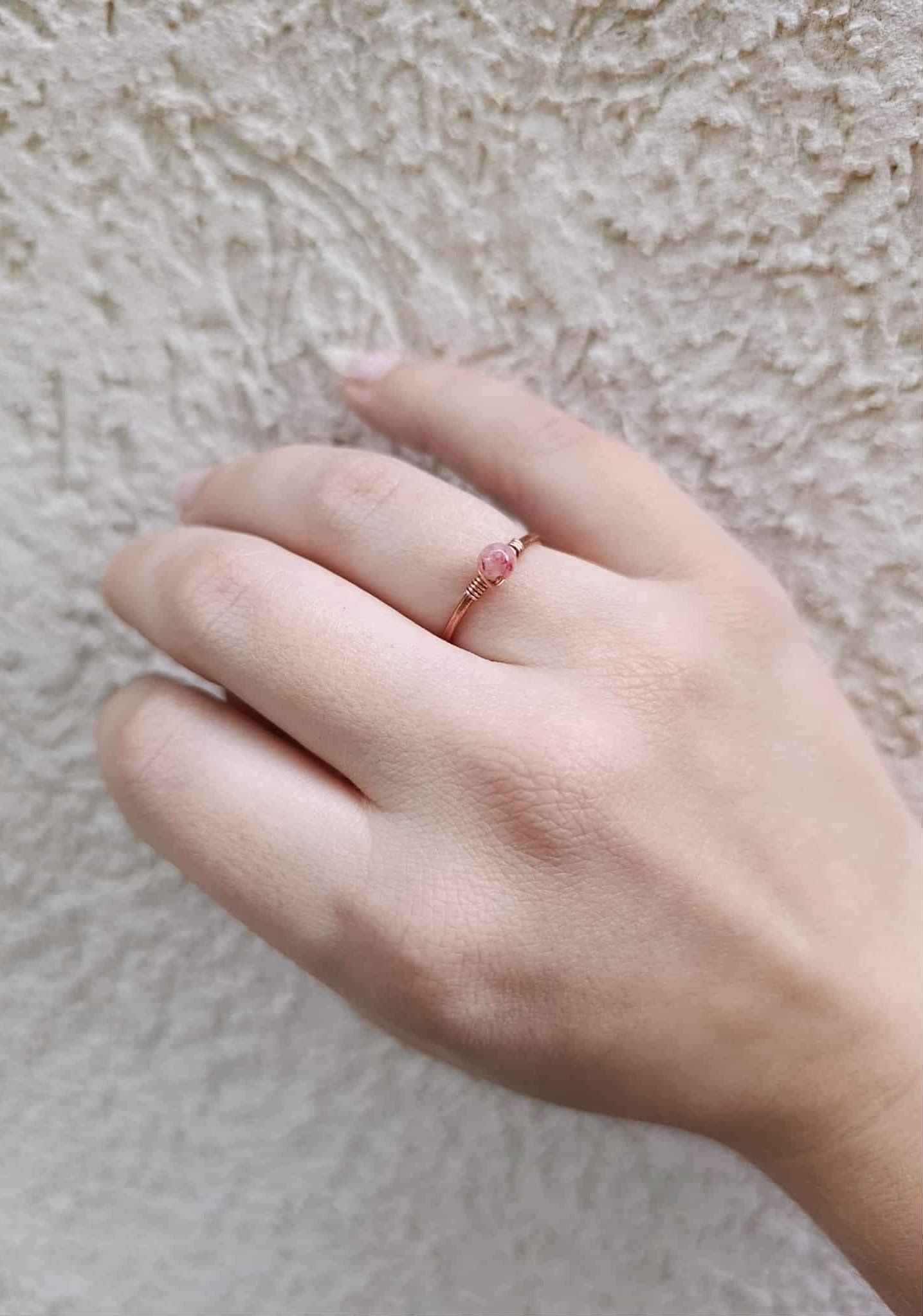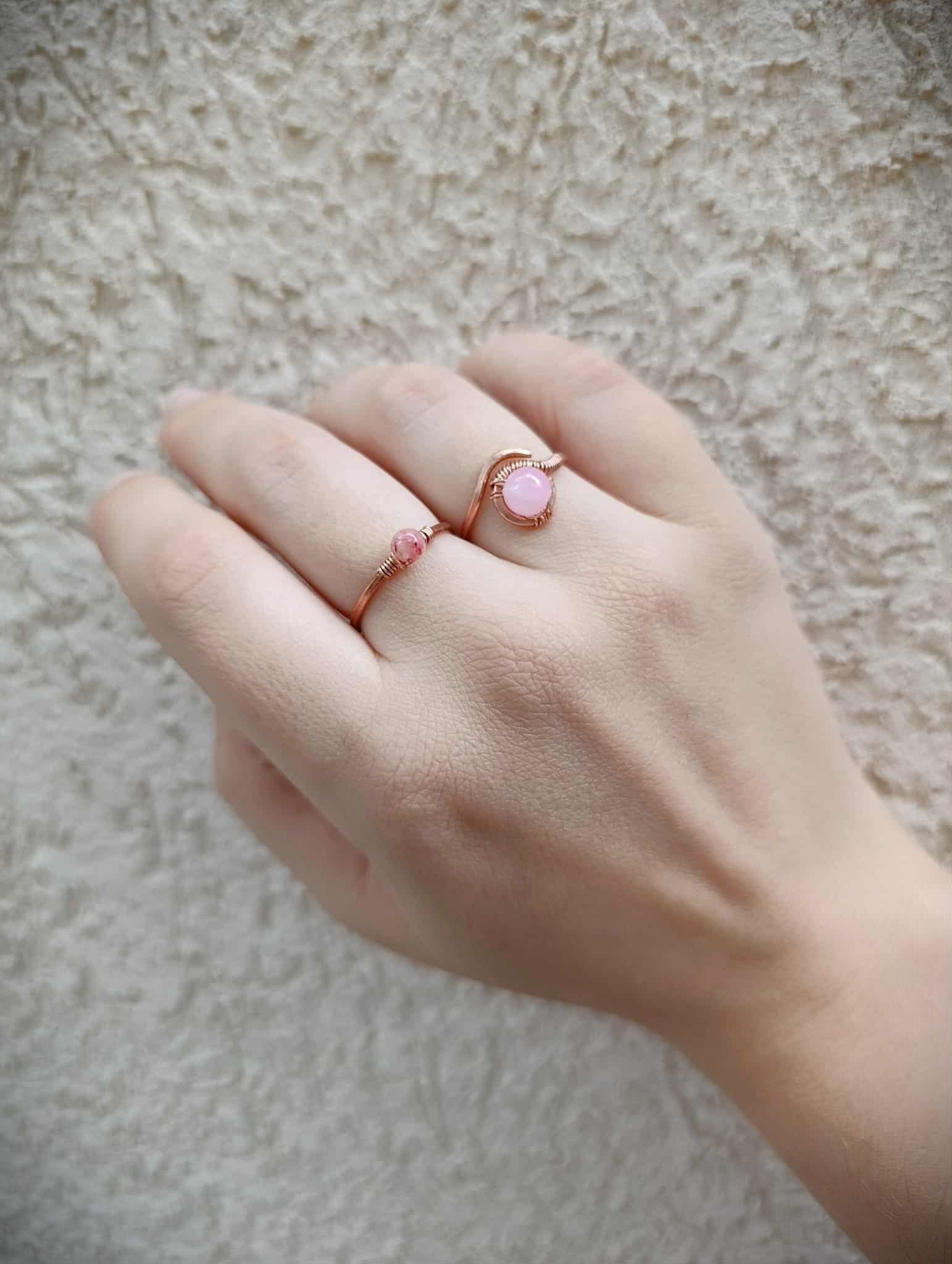 A pink jáde gyűrű átmérője kb 18mm, a cseresznyekvarc gyűrű állítható